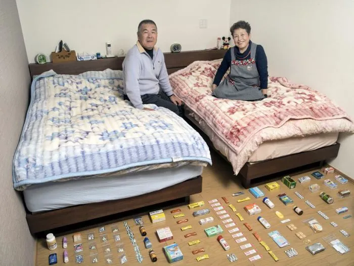 70-летний Ясумаса и его 66-летняя супруга Нобуко — японские пенсионерыПара живет в Токио. Ясумаса пьет препараты для сердца (на фото они в прозрачных пакетиках).