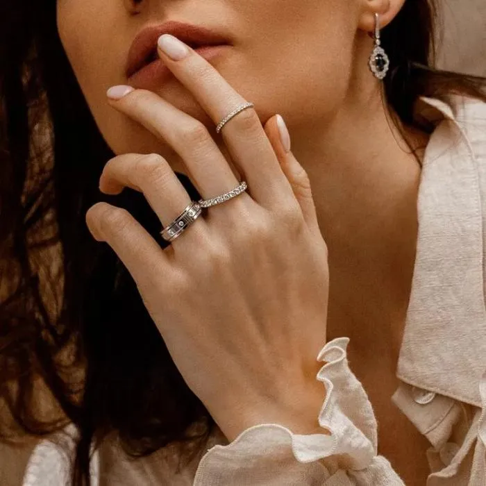 Один из классических, но от того не менее привлекательных помолвочных вариантов – кольцо вечности, усыпанное драгоценными кристаллами по всей окружности ободка. Эта модель довольно универсальна: не конфликтует с другими украшениями и уместно смотрится в любой обстановке. Но главное – служит символом любви, что пройдёт через долгие годы.