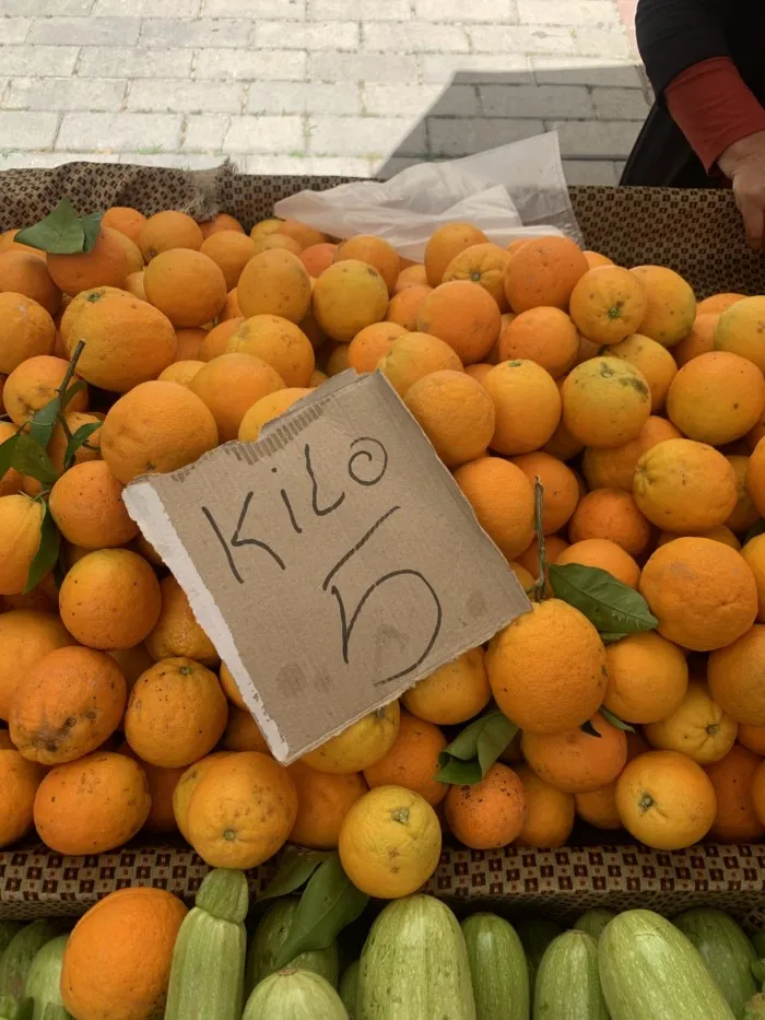 Апельсины. Тут В турции апельсины не едят почти, только давим сок. Еще есть сорт красных апельсинов, те немного дороже. Сам апельсины не люблю. Стакан сока приводит к изжоге сразу. Сын любит. И жена.