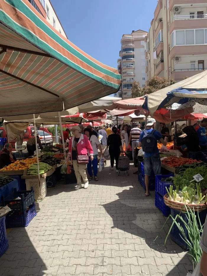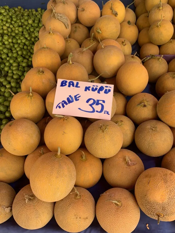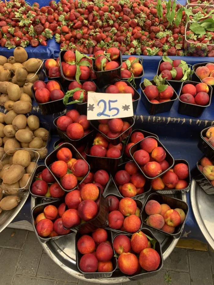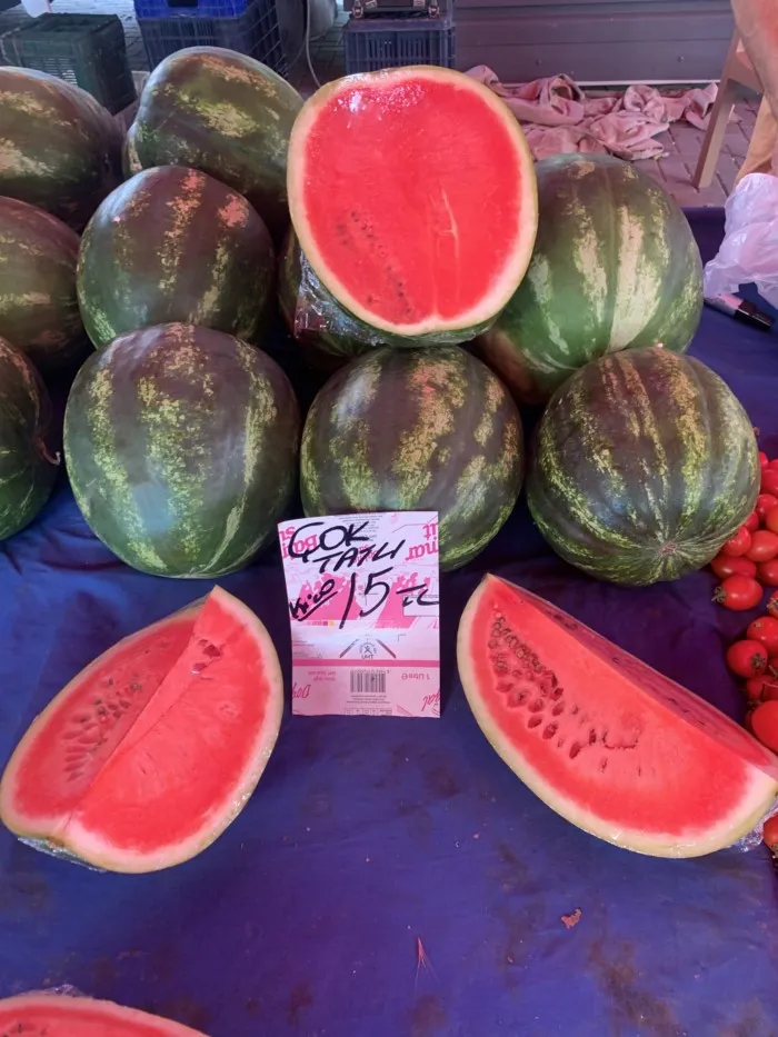 Арбузы пока тоже относительно дорогие- через пару тройку неделю будут стоить 3-5 лир. Уже сладкие . Можно купить кусочек. Целый арбуз покупают редко. Почти всегда открывают на рынке.