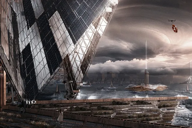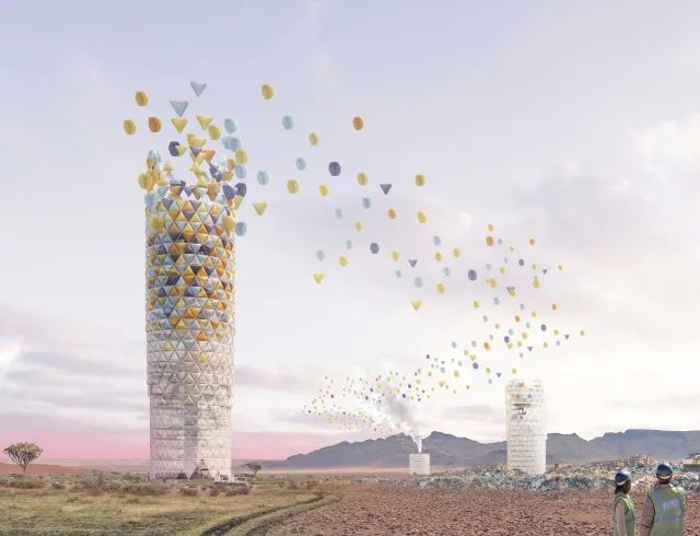 Небоскрёб представляет собой место, где пластиковые отходы могут быть полезны. Сама башня построена из переработанного пластика, а панели, надутые сжатым воздухом, можно превратить в паровые шары, которые будут опылять территории вокруг.