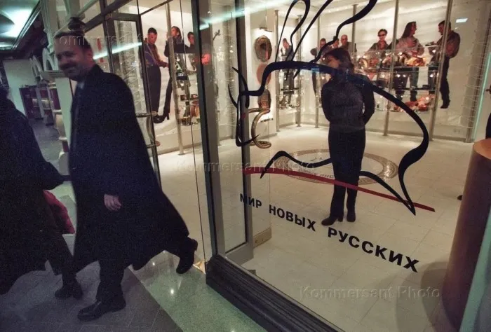 У входа в магазин «Мир новых русских» на Арбате, 1998 год.