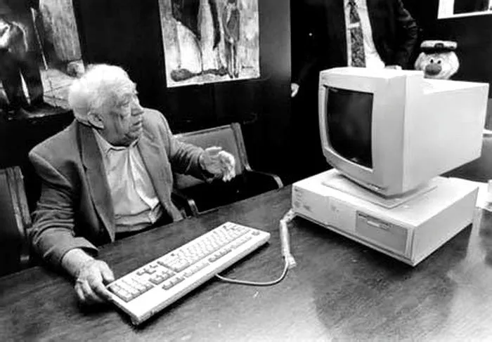 Юрий Никулин осваивает компьютер на рабочем месте. Москва, 1995 год.