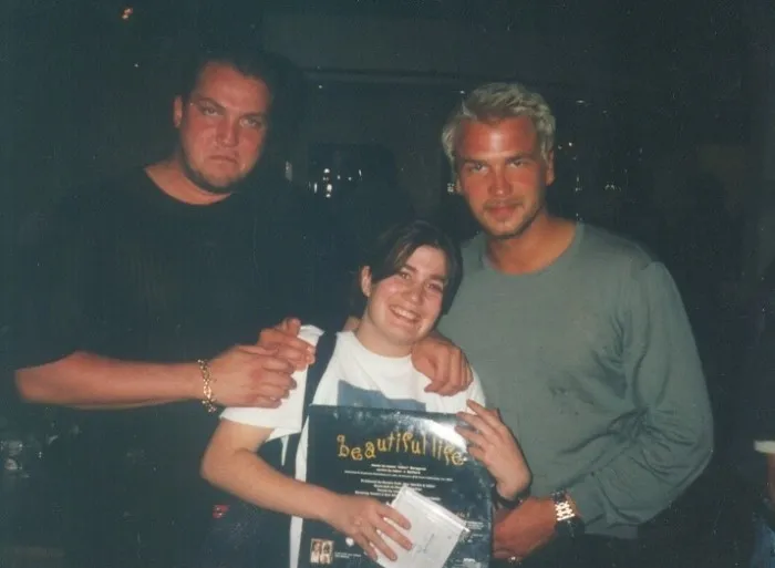 Участники группы «Ace of base» с поклонницей. Москва, 1998 год.