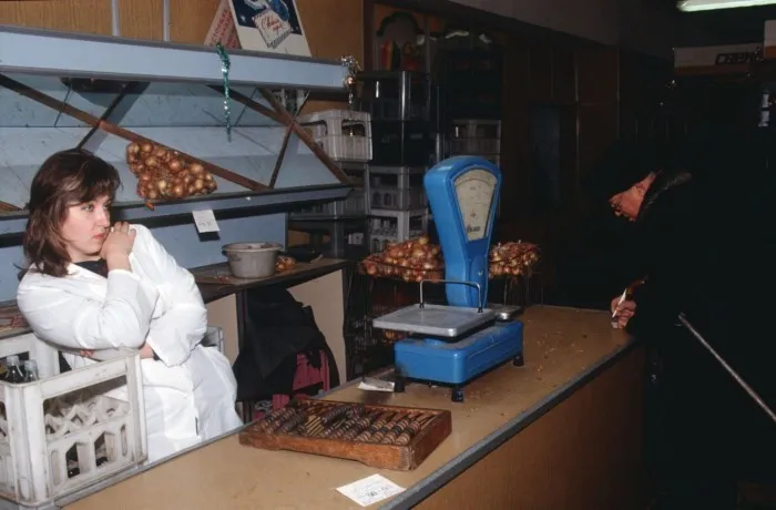 Продавец в продуктовом магазине с весами и счетами. Москва, 30 декабря 1991 года.