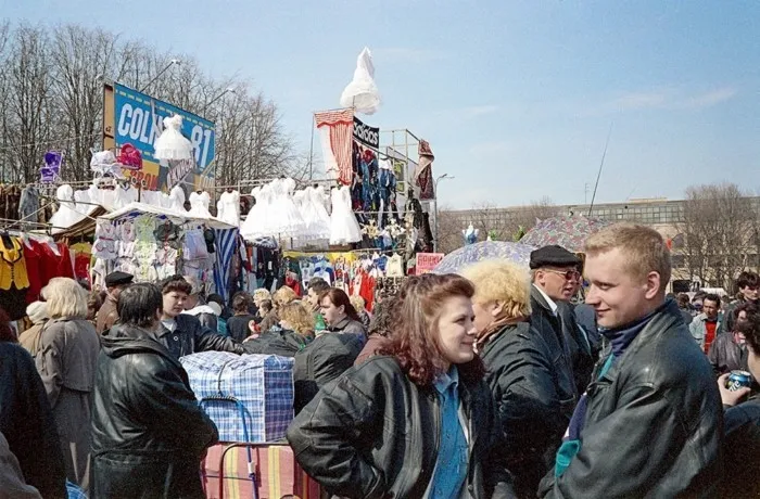Оживлённая торговля на вещевом рынке в Лужниках. Москва, 13 марта 1997 года.