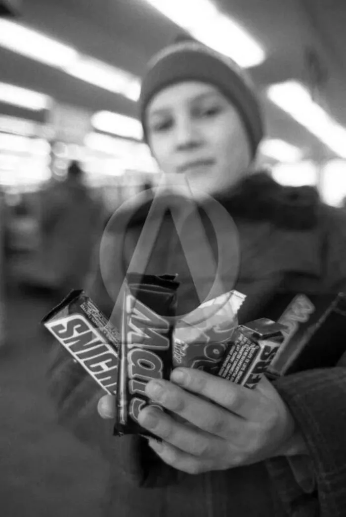 7. Парень с набором только что купленных шоколадных батончиков. Москва, январь 1991 года.