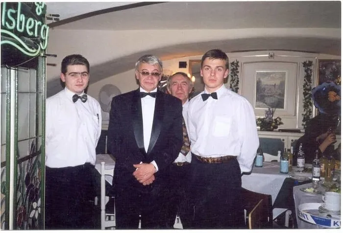 18. Фото на память. Актёр Александр Демьяненко с работниками ресторана. Россия, 1990-е годы.
