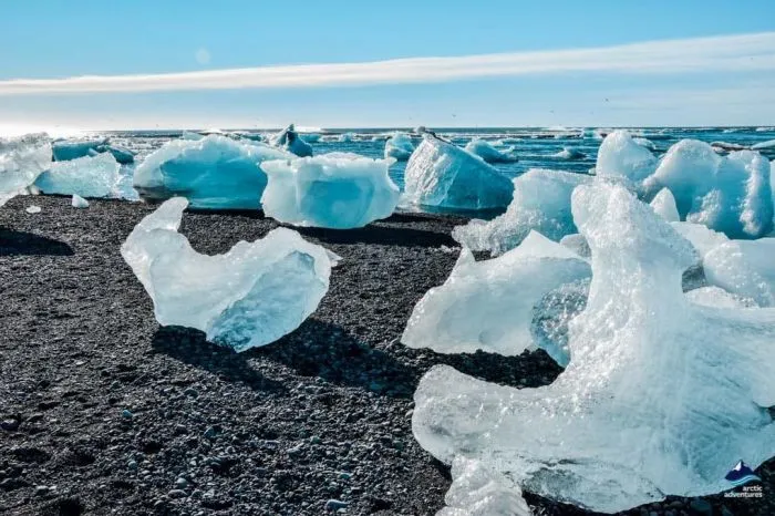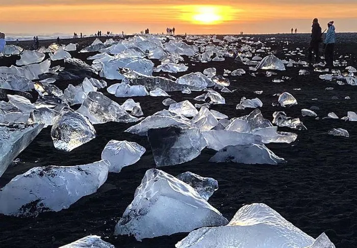 Но сам по себе лёд не слишком интересен. Туристов из разных стран на Алмазный пляж притягивает именно удивительное сочетание – искрящаяся прозрачность «алмазов», холодная голубизна моря и строгая окантовка чёрного вулканического песка.