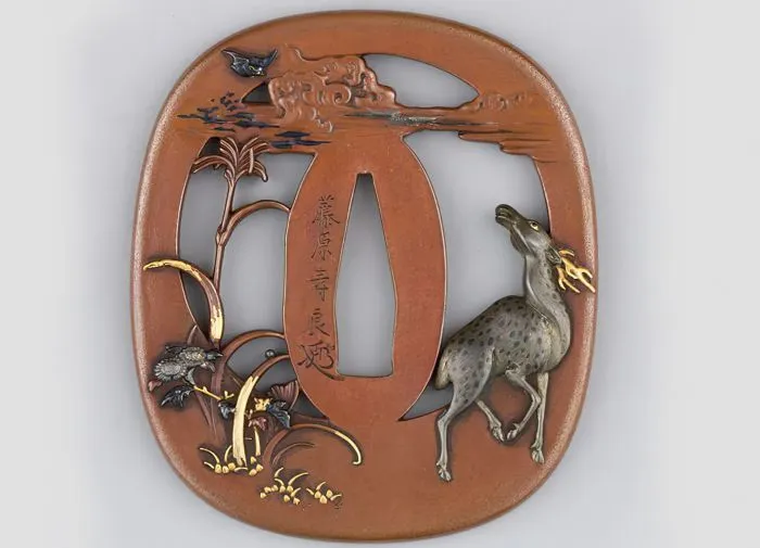 20. Цуба (гарда) японского меча, работа мастера Мурасакибары Тошиёши (1829—1890 гг.). Мастерство изготовления цуб в Японии было передаваемым по наследству ремеслом