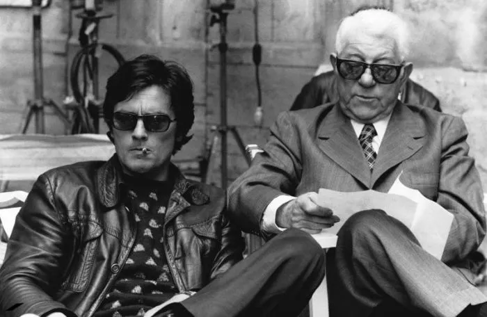 25. 26 июня 1973 года. Париж. Ален Делон и Жан Габен на съемках фильма «Двое мужчин в большом городе». Фото Jean-Pierre Bonnotte.