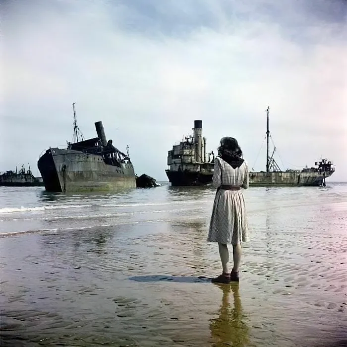 3. Женщина на пляже Омаха, Нормандия, Франция, 1947 год. Через три года после того, как союзные войска вошли в оккупированную немцами Францию