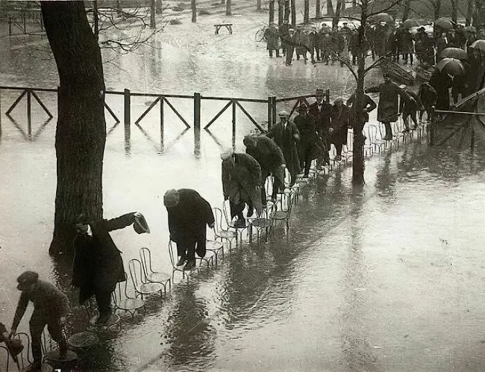 20. Парижане идут по стульям, чтобы не замочить ноги во время наводнения, 1924 год