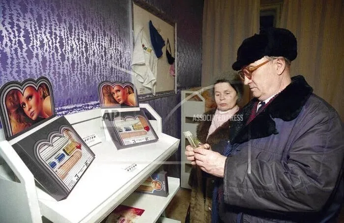 24. Супружеская пара в магазине интим товаров. Россия, 1990-е годы.