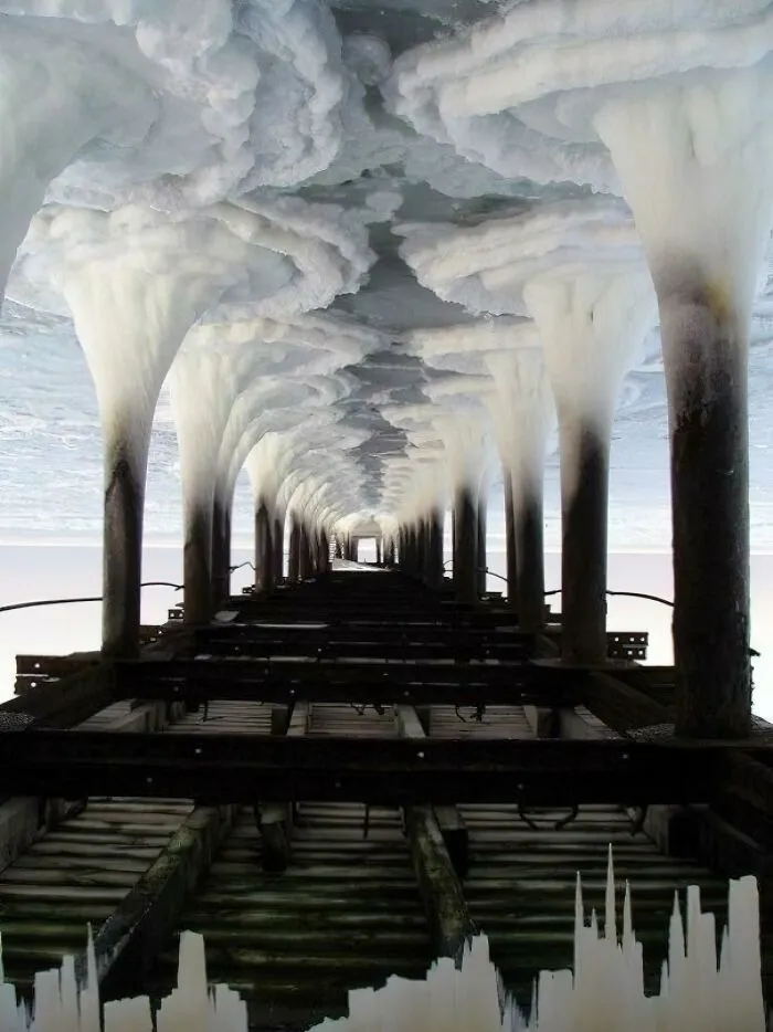 2. Замёрзшая вода под пирсом. В перевёрнутом виде — городской индустриальный пейзаж