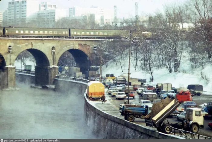 26. Москва, 1994. Андроньевская наб. мост Курской ж/д. Самосвалы сбрасывают снег прямо в Яузу