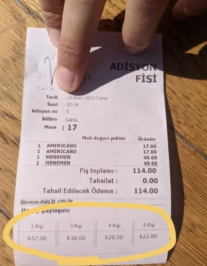 16. В Турции есть ресторан, в чеках которого показано, как можно легко разделить счет, и вам не придется делать никаких вычислений