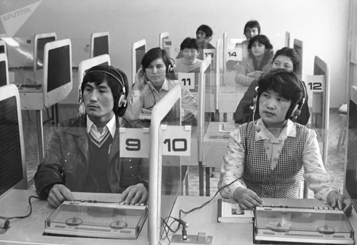Студенты во время занятия в лингафонном классе в Казахстанском государственном университете имени М.И. Калинина в Алма-Ате, 1984 г.