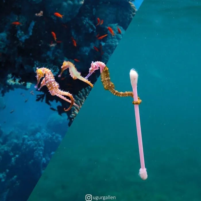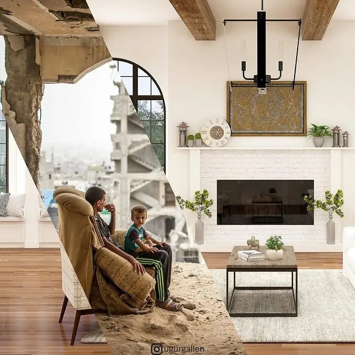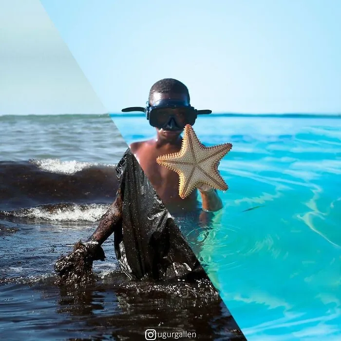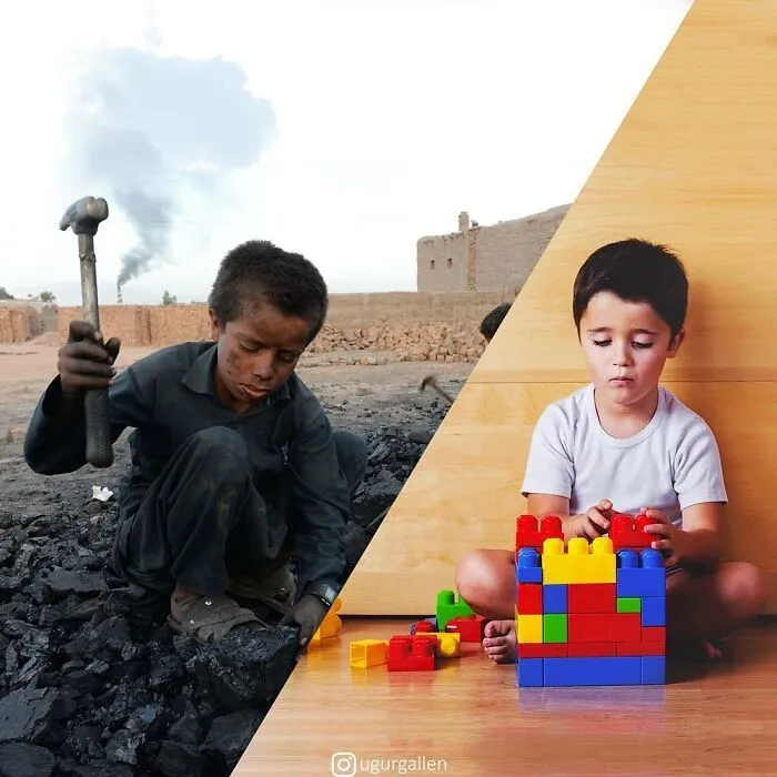 "Я стремлюсь показать социальные проблемы, которым подвержен наш мир, такие как несправедливость, война, изменение климата и т.д., путем сопоставления двух фотографий в одном кадре. В своих работах я иллюстрирую контрасты между двумя разными мирами, в которых мы живем, и побуждаю задуматься о принятии решений, которые позволят минимизировать эти проблемы", - говорит Угур.
