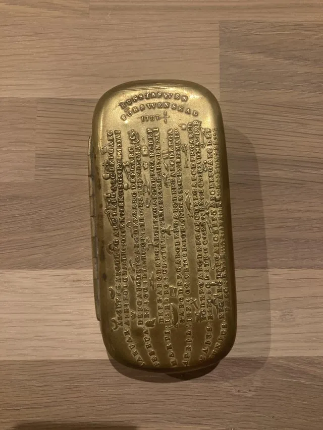 Золотая коробка 1787 года с месяцами по обеим сторонам, за которыми следует ряд букв и цифр. Найдена на чердаке
