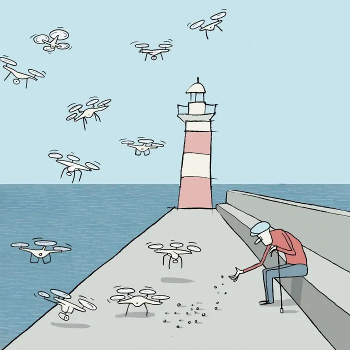 В своих работах художник ловко смешивает реальность и карикатурность, приправляя это всё добротной порцией иронии. Его герои не говорят, они сохраняют абсолютное молчание. Однако нам всё равно понятны все действия, разворачивающиеся на наших глазах, ведь Юваль оставляет нам множество подсказок — эмоции, пейзажи и мелкие, но очень важные детали. Соединив всё воедино, мы получим удивительную историю, которая обязательно заставит нас задуматься и поразмышлять.