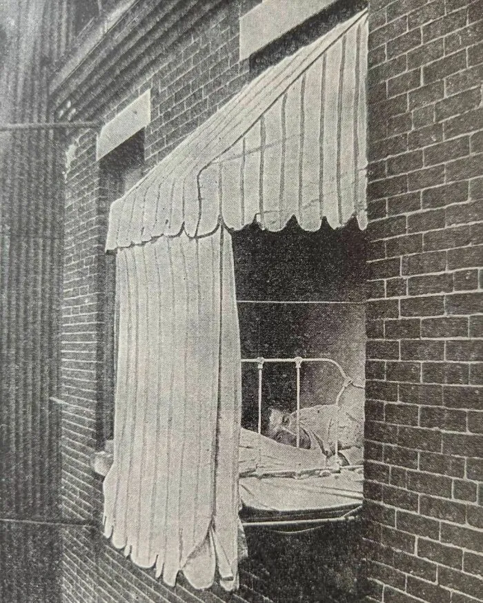 Оконную палатку первоначально разработали для больных туберкулезом, которым требовался сон на свежем воздухе. Устройство оказалось настолько удобным и бюджетным, что стало популярно среди здоровых людей. Тент на стальной раме крепился к стене над окном, а внутри комнаты располагалась закрытая часть палатки. Так воздух оставался в самом тенте и не охлаждал помещение.