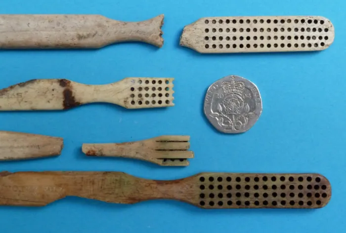 Старая зубная щетка, сделанная из кости. Щетки были довольно дороги, и, как следствие, элитны. Бедняки чистили зубы по-разному, то палочкой, то щеткой из корешков и щетины, то тряпочкой с золой или сажей.