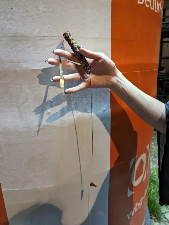 7. Нашла на улице, металлическая деталь, прикрепленная на конце длинной веревки, проходящей через бамбуковую трубку, обмотанную разноцветными веревками.