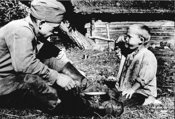 8. Советский солдат кормит мальчика кашей из своего котелка