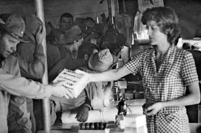 32. Лучший продавец военторга по итогам социалистического соревнования Зинаида Анисимова предлагает товар покупателям. Афганистан, 1980 год