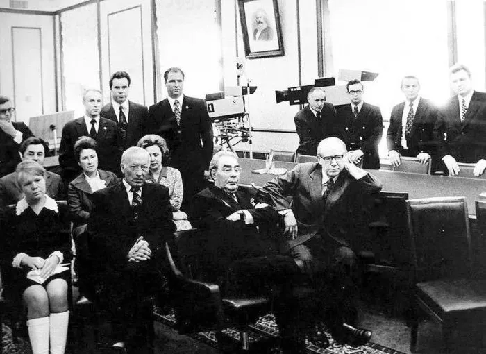 34. Брежнев и товарищи на просмотре новинок мирового и отечественного кинематографа, Москва, 1975 год