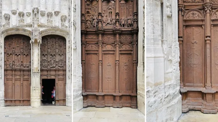 Начало строить этот шедевр а 1225 году, а условно закончили (с кучей обрушений в процессе), уже после 1600. Отчего частично сабор является шедевром пламенеющей готики. Например, вот эти двери.