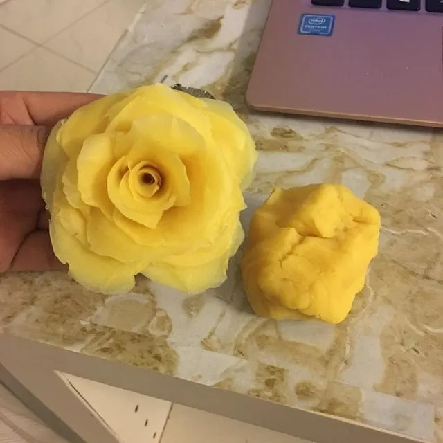 У меня такое ощущение, будто это фотография настоящей жёлтой розы рядом с куском пластилина.