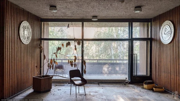 Пахнет сыростью, под ногами устало скрипит осыпавшаяся штукатурка, но залитый светом из панорамных окон зал всё равно выглядит уютно. Его не портят ни облезшая краска на стенах, ни толстый слой пыли на столах и стульях, ни колонии мха разросшиеся под протекающим потолком. Покажи мне несколько лет назад снимки этого места, я бы сам принял его за заброшку где-нибудь в глухом уголке США или Европы (как последний вариант я бы называл Восточную Европу или Прибалтику)