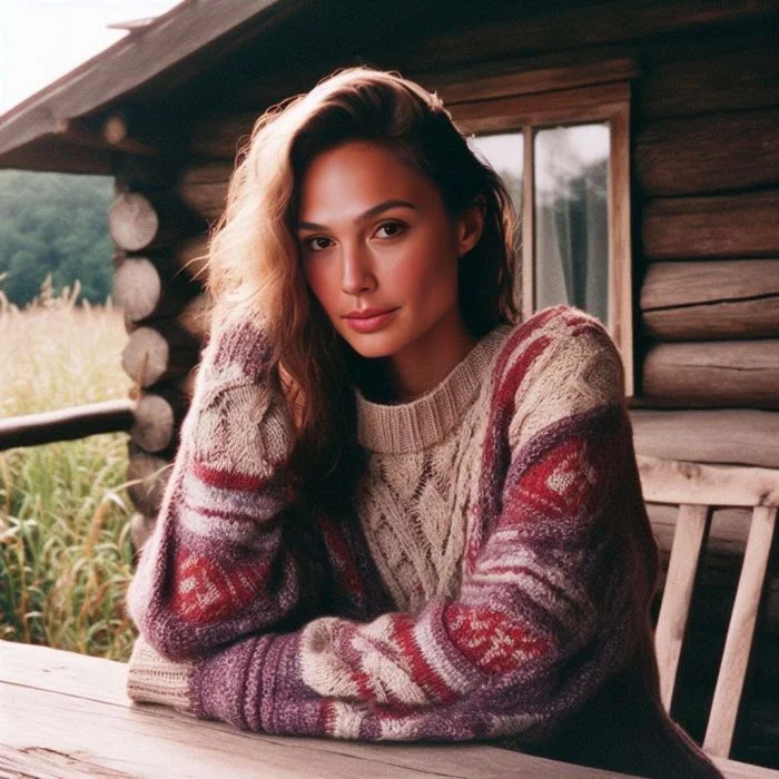 Галь Гадот (Чудо-женщина) сидит в свитере крупной вязки на фоне деревянного домика.