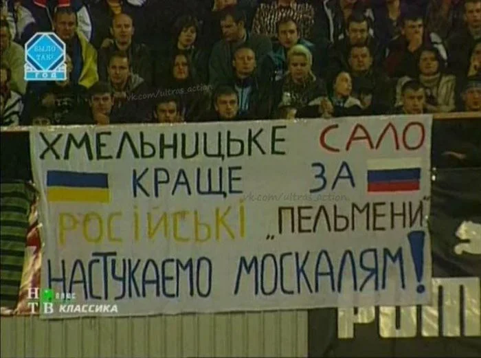 Отборочный матч Евро-2000. Украина - Россия 3:2. Баннер болельщиков сборной Украины: "Хмельницкое сало лучше российских пельменей. Настучим москалям!"