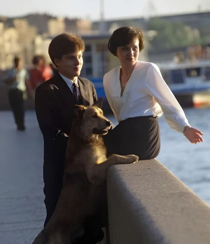 38. Молодые люди с собакой отдыхают на набережной в Санкт-Петербурге, 1993 год