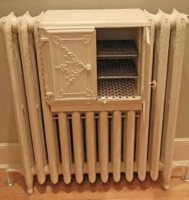 Квартирный паровой радиатор 1890-х годов со встроенным подогревателем еды. В европейских и американских домах конца 19 века можно было увидеть крайне необычный отопительный прибор — чугунный радиатор со специальным шкафчиком для посуды. Такие приспособления устанавливались на кухнях либо в столовых. Впервые это чудо появилось в 1892 году в США. Несколько позже приспособление появилось в домах европейцев. В конце 19 века отопительный прибор с дополнительными функциями можно было встретить и в России.