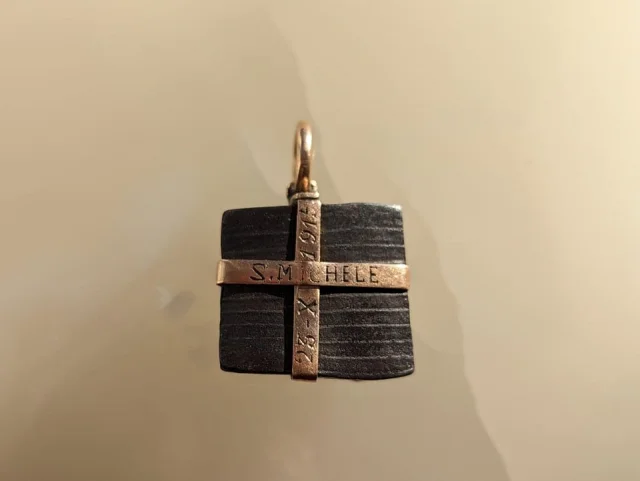 Шрапнель от артиллерийского снаряда, которую впоследствии превратили в кулон, 1915 год. Сам талисман обернут в 14-каратное золото и выполнен в виде подвески.