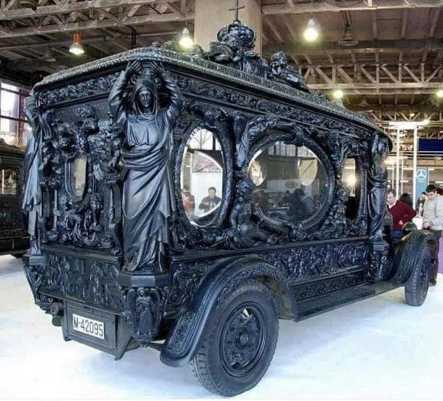 Вырезанный вручную катафалк 1920-х годов. Автомобили для похорон изначально делали в тех же мастерских, что и конные экипажи. Поэтому в из дизайне нередко появлялись похожие мотивы. При оформлении ритуальных авто нередко применялась резьба, а для украшения использовались вазоны, колоны и скульптуры разной формы.