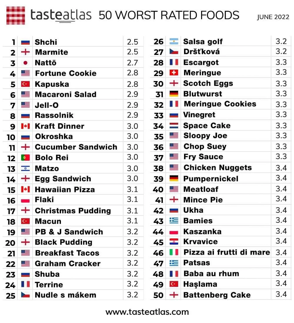 Итак, перейдем к подведению итогов уходящего года. В этот раз наш разговор будет в буквальном смысле "вкусным", так как мы будем обсуждать еду. Редакция сайта TasteAtlas решила погрузиться в мир кулинарии и составить ТОП-15 самых не вкусных блюд 2023 года. Некоторые позиции в списке оказались весьма оправданными. Однако есть такие блюда, которые, по мнению редакции, заслуживают быть исключенными из этого рейтинга. Как вы думаете, какие блюда попали в этот список несправедливо?