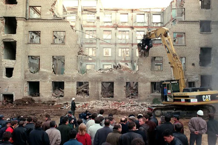 14. Снос бывшей больницы в Очаково для реновации квартала под жилую застройку. За пультом управления экскаватором сидит лично Лужков.