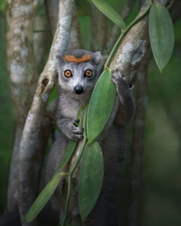 Любопытный лемур в самом сердце мадагаскарского леса держит в лапках листья ванили - ароматное сокровище, спрятанное среди ветвей. Фотогеничный товарищ!