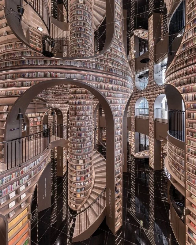 Перед нами разные интерьеры книжной сети «Чжуншугэ». Когда их создают, то таких объемов достигают за счет использования зеркал.