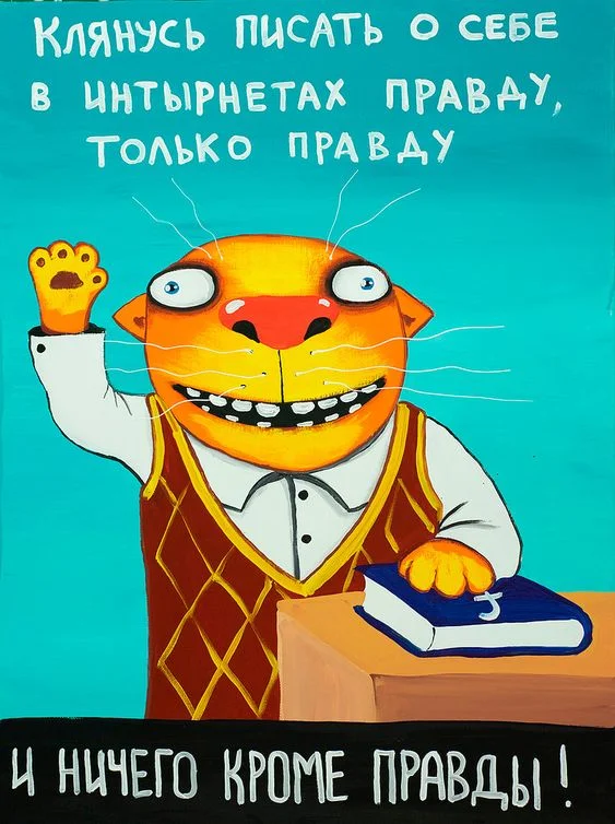 - Будучи произведением Искусства на стыке дисциплин, что неискушённому зрителю кажется фрагментированным разрозненным собранием дурацких картинок, мои посты нацелены на то, чтобы у зрителя начал работать мозг. Пусть подчас это делается как в старом анекдоте про то, чтобы заставить кошку съесть горчицу – Русский путь – отрубить кошке хвост и намазать обрубок горчицей. Кошка будет слизывать кровь и сожрёт горчицу… Так и я со своей идеей Легализации… Но главное, что я хотел бы, - чтобы зритель самостоятельно пришёл к Просветлению. Дальше всё будет понятно. Надеюсь, мои посты помогут визуализировать некоторые направления Полёта Мысли, и, надеюсь, укрепят Ищущих в их поисках… 😊