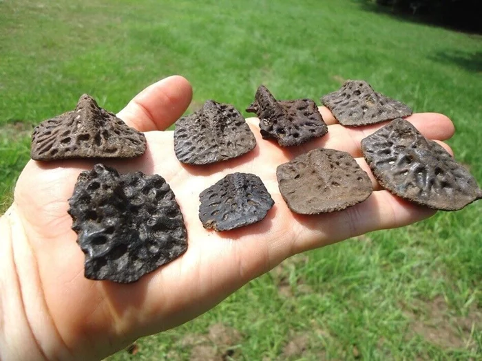 А судя по виду, это остеодермы - окостенения, костные пластинки, располагающиеся в коже некоторых животных. Остеодермы, как правило, имеют небольшой размер и пластиновидную форму. Вот остеодермы крокодила в ливерпульском музее. Так что просто под кожей на щите оголились окостенелые пластинки.