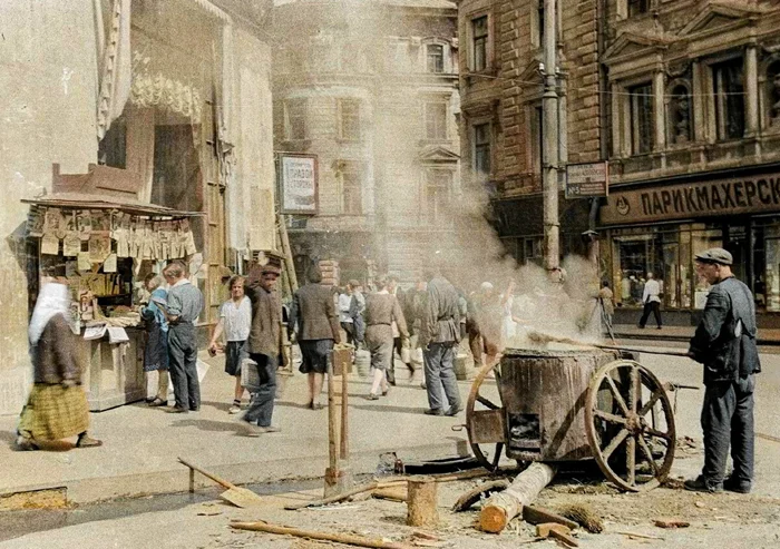 Уличные работы на углу Столешникова переулка и Петровки, 1925-1930 гг.