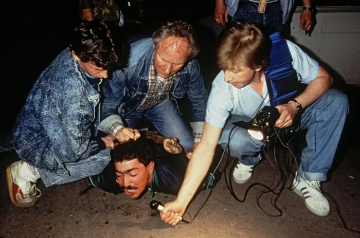 Репортер берет интервью во время задержания члена этнической мафии. Москва, октябрь 1991 года.