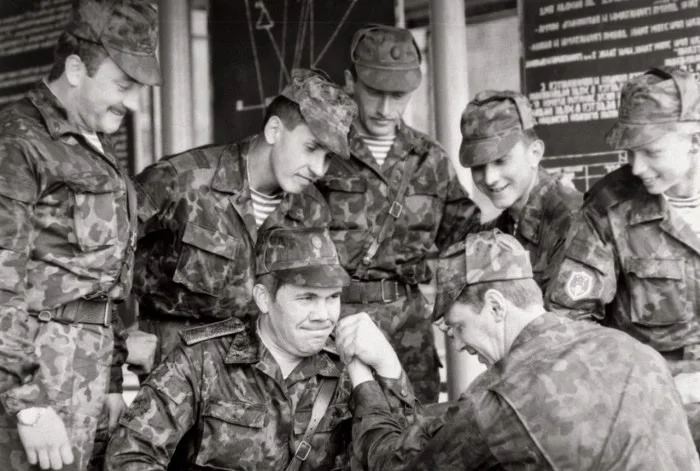 Командующий 14-й гвардейской общевойсковой армией РФ генерал-лейтенант Александр Лебедь борется на руках, Молдавия 1992 год
