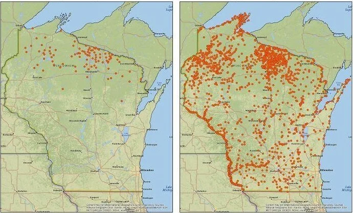 3. Гнёзда белоголовых орланов в 1974 и 2019 году в штате Висконсин, США. Улучшение ситуации связывают с законом о чистой воде, который регулирует загрязнение вод